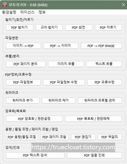 다운로드 후에 프로그램을 실행시키면 위와 같은 화면이 나타나는데요. PDF 합치기 기능은 여러 개의 PDF 파일을 하나로 합치는 기능입니다. 순서를 바꾸어 합칠 수 있어서 유용하고요. 이미지 -> PDF 기능도 꽤 유용합니다. 그 외에 편집기 따위가 있지만 자잘한 것들은 오류가 있기도 하고, 잘 쓰지 않는 메뉴라 추천드리지는 않습니다. 단순한 기능만 쓰신다면 추천합니다.
